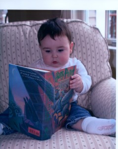 visit Hogwarts at Universal Studios. Here’s a picture of you “reading” Harry Potter when you were but a wee bitty pup. The seeds of reading were planted at a young age, my friend.