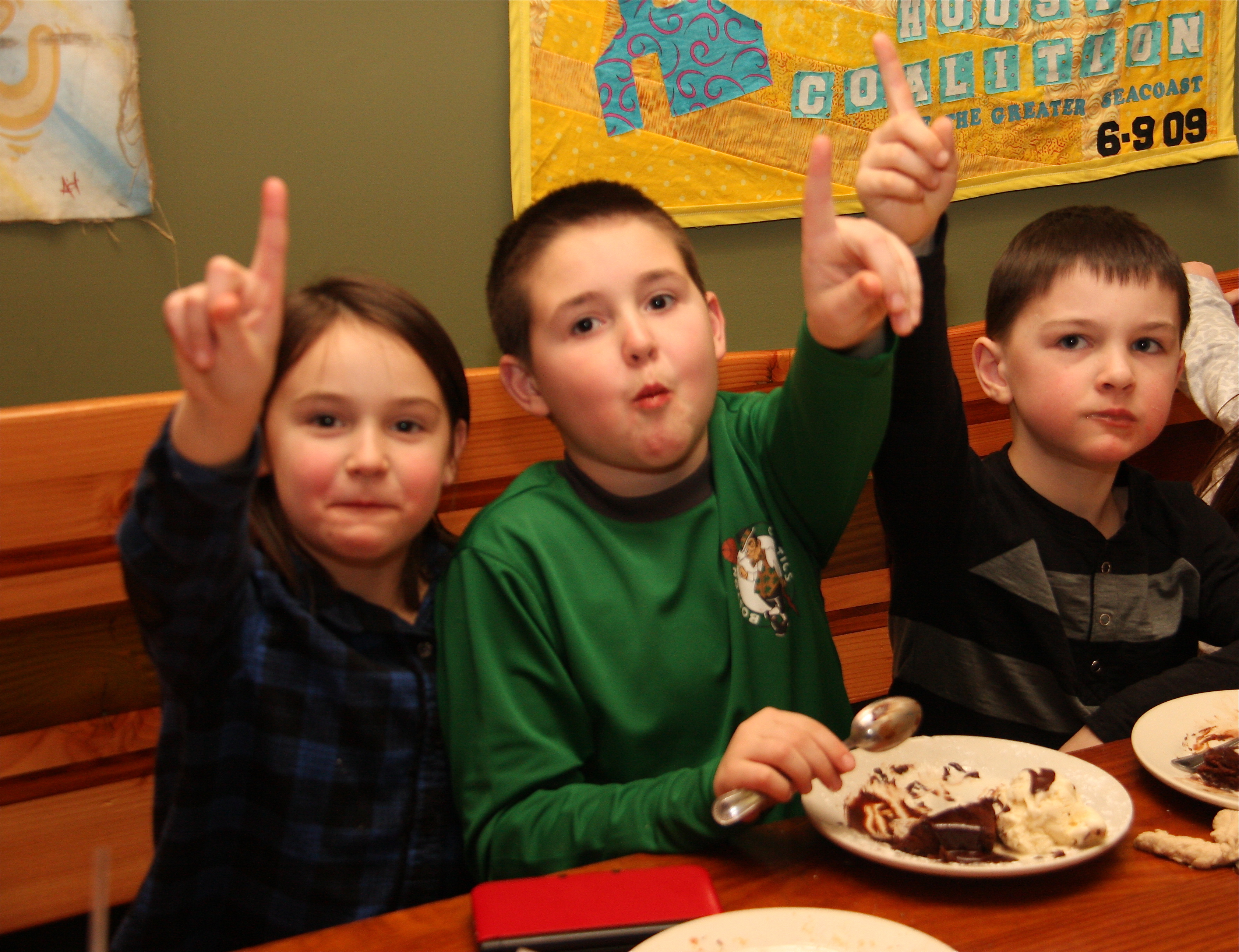 On Sunday, January 6 we all visited Flatbread pizza in Portsmouth instead of coming to the G&P homestead. We love their private room - it fits all of us nicely with long benches and plenty of privacy. We close the doors on both ends and have our own special restaurant. Sometimes we sneak out to see the brick oven fire and the pizza baking. You guys like the pizza, but the brownie sundaes are the real treat. All for one and one for all!