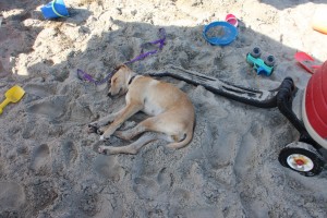 After checking out the beach scene a little while, Allie dug a hole in the sand under the umbrella, rolled up in a ball and fell to sleep.