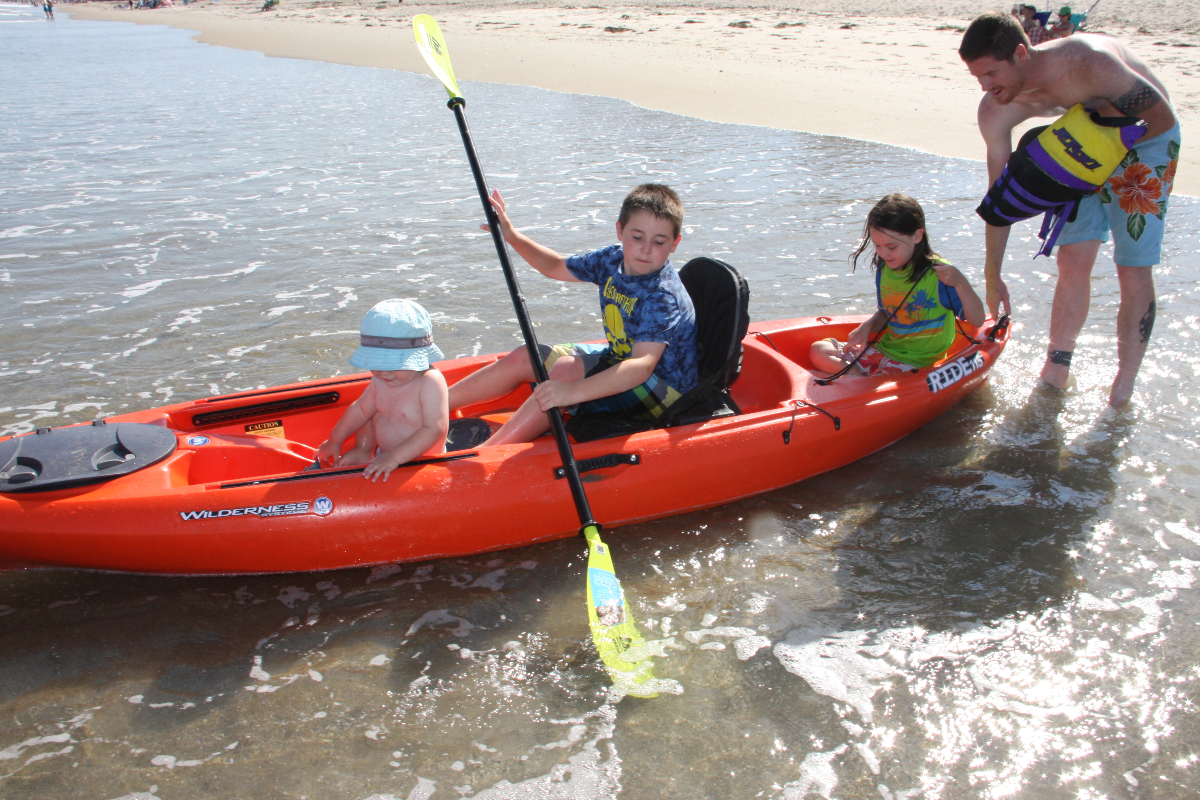 We made a fort, dug a puddle, played frisbee, went boogie boarding, tossed the ball around and constructed a gravity-driven tennis ball dueling ramp out of sand. Later on, you sat in my new kayak and I took you for a few wave rides in the shallow water. You, Emma and Jack couldn’t get enough!