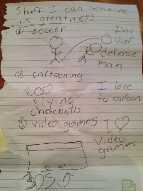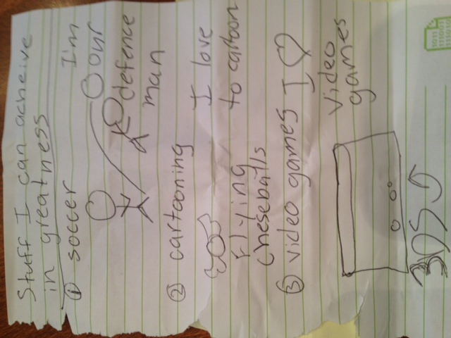Your Mom made me aware of this. You were very low key about it... didn't want anyone to see it. You kept it in your room. But I got my hands on it and snapped a photo. I just love how someone - YOU - only nine years old (okay on the cusp of 10) can think of something like this. My favorite part is the headline "Stuff I can achieve in greatness." The idea of achieving greatness - love it! Thinking about what you enjoy most out of all the things you do, being aware of what makes you happy and having personal insight into some of your strengths... that's fantastic. To achieve greatness we have to all start with the idea of achieving greatness... without a plan, a goal, an objective... a DREAM... nothing happens. I know you will achieve greatness in your lifetime Ben. So keep dreaming, thinking and make it happen!
